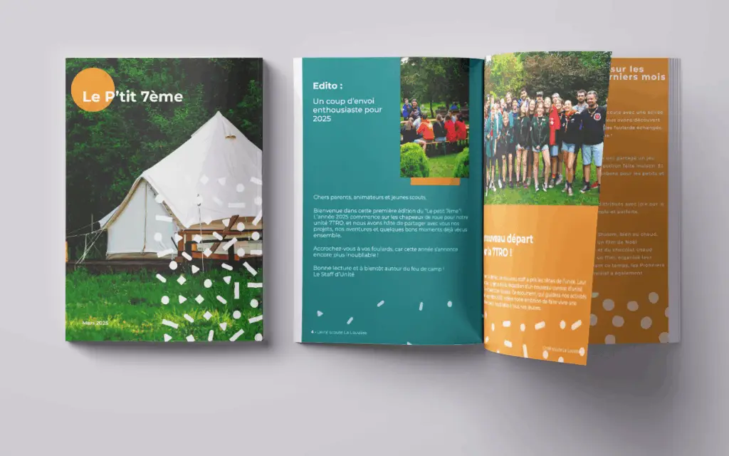 Maintenant que je suis animateur d’unité, je crée quelques visuel comme une nouvelle identité graphique à créer le logo, un semestriel, des affiches pour certains évènements et le site internet sur WordPress, en mon rôle de chef d’unité je forme les jeunes pour leurs animations afin de transmettre certaine valeur scouts et de leurs responsabilité.